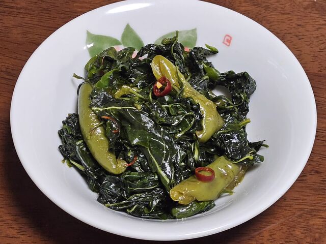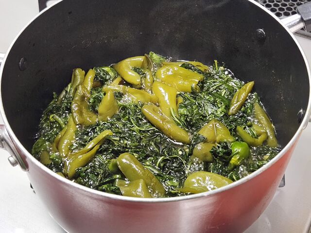 「オカーさん 今年もピーマンの葉っぱを煮て」
